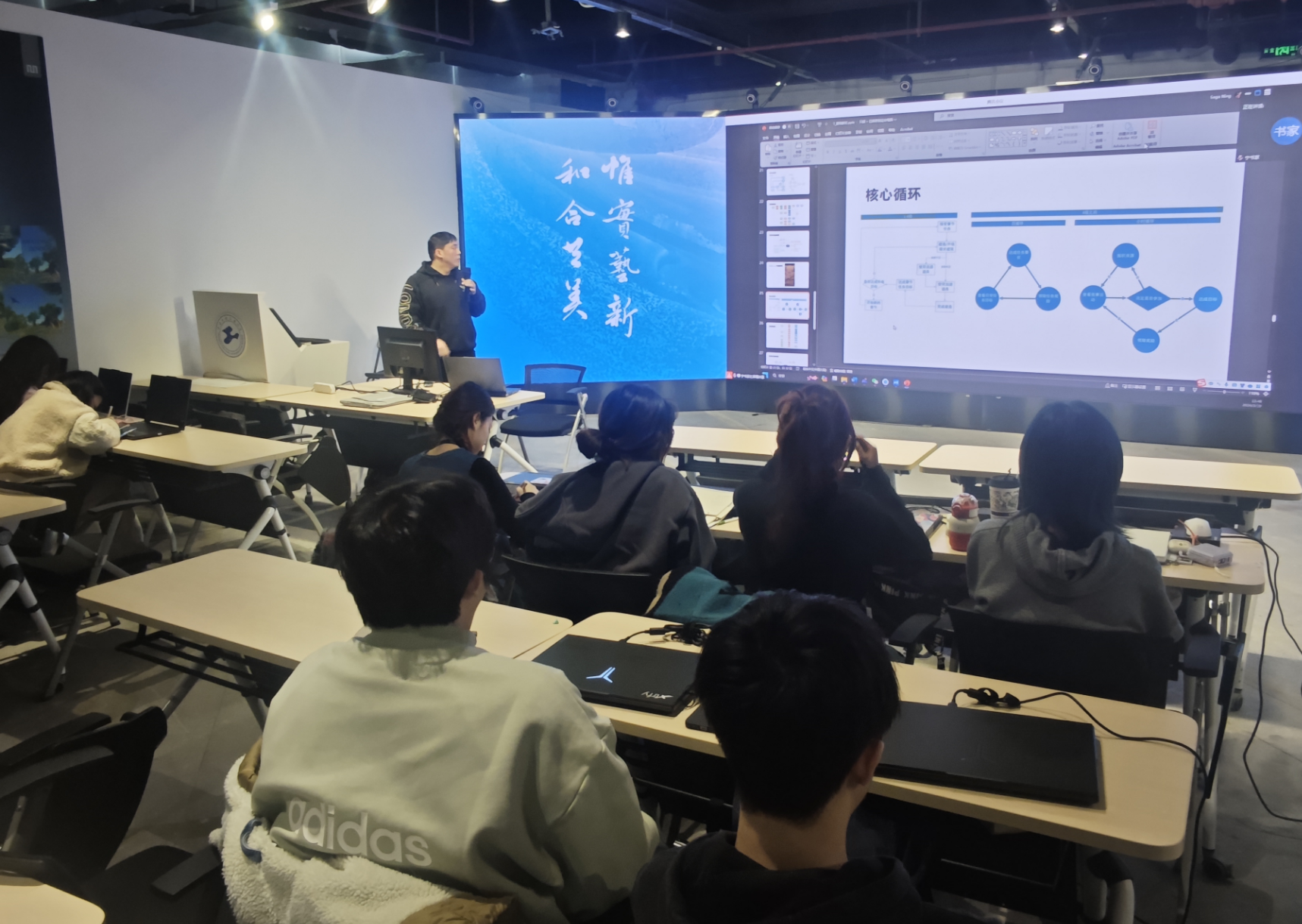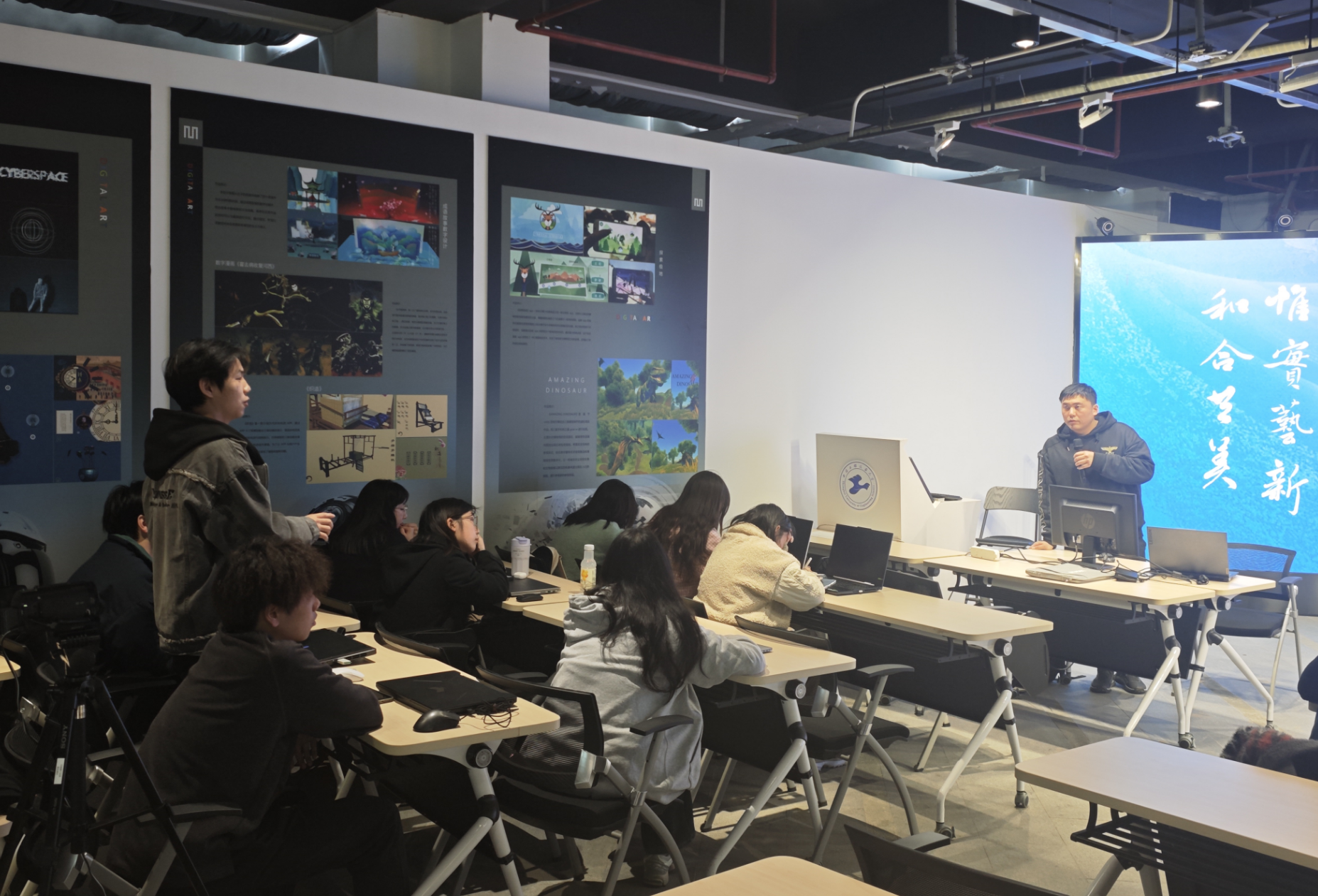 此次课程为2023级《新媒体艺术》课程,金老师先介绍了数字媒体艺术中商业项目的需求,以游戏项目为例介绍相关行业标准与项目的执行流程。然后从项目的策划角度分享了一些国内外的项目案例,给员工介绍在游戏及交互设计商业项目中的团队构成与岗位需求,同时也让同学们了解目前行业中项目策划团队的工作内容,项目策划案的撰写规范等前沿的专业知识。同学也根据自己的游戏体验和兴趣踊跃提问,有的同学好奇游戏抽卡保底运营机制,有的同学对游戏外挂的管控感兴趣,金老师从交互设计中的用户体验与服务和数值策划等多方面回答员工们的提问。