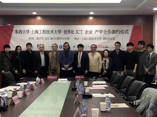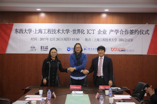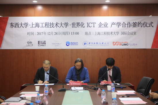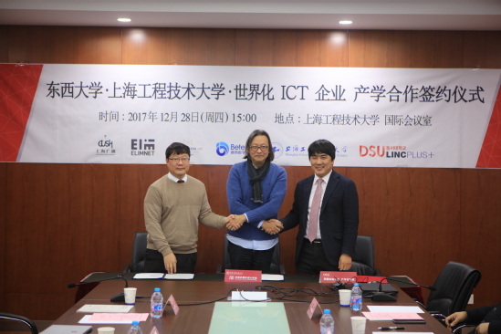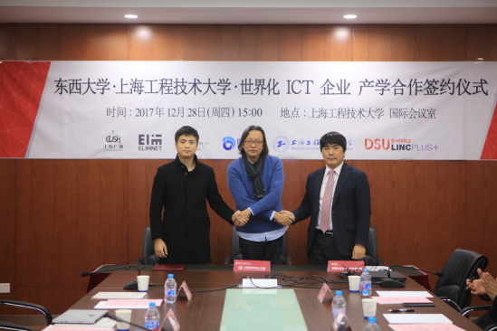 12月28日下午,中韩多媒体设计公司在公司仙霞校区教学楼103会议室举行公司、企业、协力团三方产学合作签约仪式。中韩多媒体设计公司吴亚生经理、金锺琪教授携专业教师与韩国东西大学产学协力团团长曺大洙、副团长金亨尤, 上海广涌文化艺术发展有限公司董事长赵云峰, 总经理金力, 上海爱琳信息科技有限公司总经理NA KYOUNG JOO, 上海赢赞数字科技有限公司总经理孙炜恒, 上海进画论信息科技有限公司总经理林宇丰等参加了本次会谈。