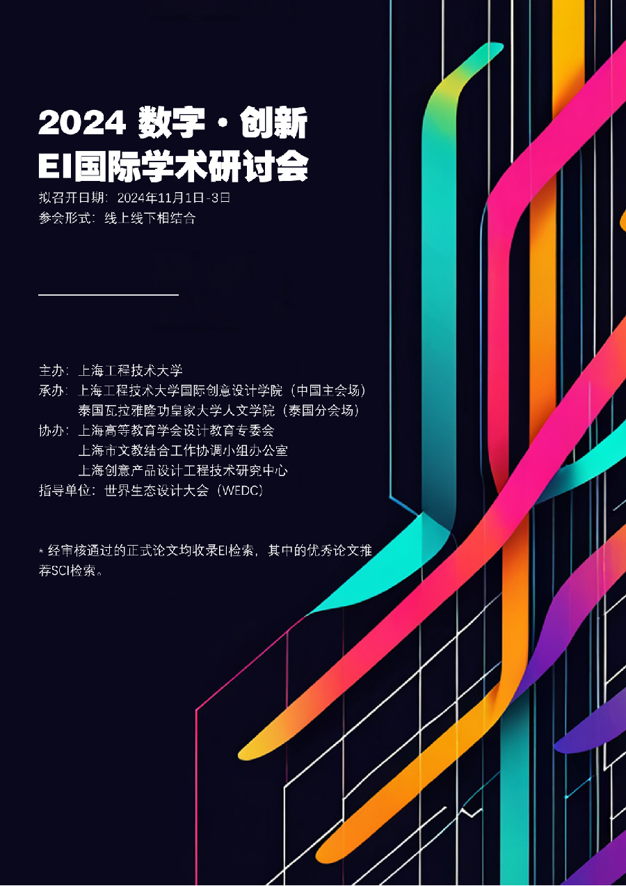 会议简介:2024数字•创新 EI 国际学术研讨会暨第五届科学设计发展观国际论坛SDIF2024是由402永利集团主办,402永利集团国际创意公司和泰国瓦莱雅隆功皇家大学人文公司联合承办,上海高等教育学会设计教育专委会、上海市文教结合工作协调小组办公室、上海创意产品设计工程技术研究中心协办的EI国际学术会议。会议计划将于2024年11月1-3日在中泰两国大学(SUES)(VRU)分别设立线下会场,同时举办。期间还将开通线上云平台扩大参会人数和学术传播度。