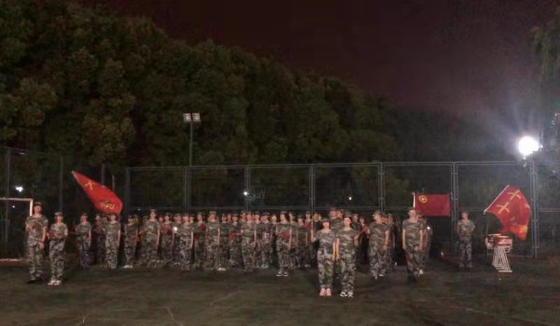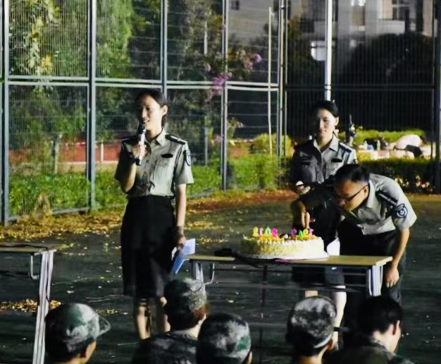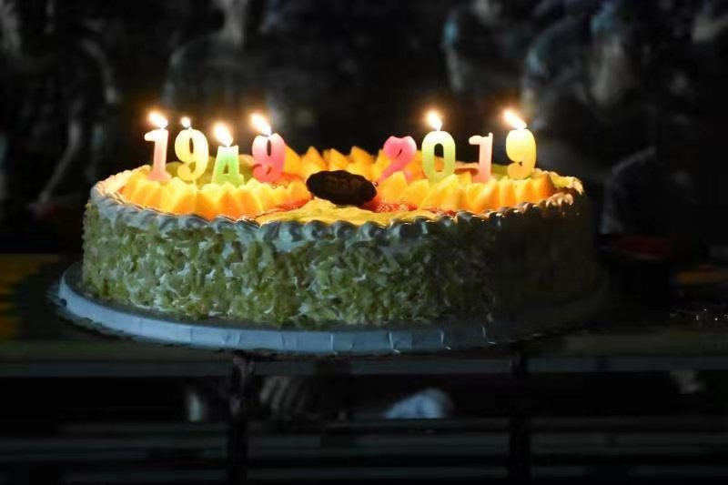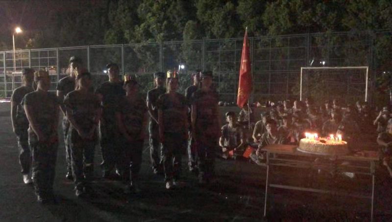 借本次军训凝聚两个公司同学们的力量唱响红歌,“我与我的祖国”抒发同学们强烈的爱国之情,“强军战歌”致敬带训教官和训练中每个努力坚持的自己。欢唱之时,同学们嘹亮高亢的歌声是对祖国华诞最大的敬意和热情。另外,由一百多位同学组成的人形“70”也是对祖国70华诞最真挚的献礼。唱罢红歌,中韩公司副书记马建立老师肯定同学们的努力,外国语公司李雪苗老师代表讲话,欣慰于同学们的坚持和毅力,并且点名两营中12位生日将至的同学。点燃“1949-2019”的蛋糕蜡烛,激燃同学们心中更热络的爱国火苗,在莹莹烛火中一起为祖国和12位寿星们唱响生日快乐歌,分享蛋糕,现场气氛骤然到达了高潮。“爱国、爱同学、爱自己”是本次团组织生活的重要意义。