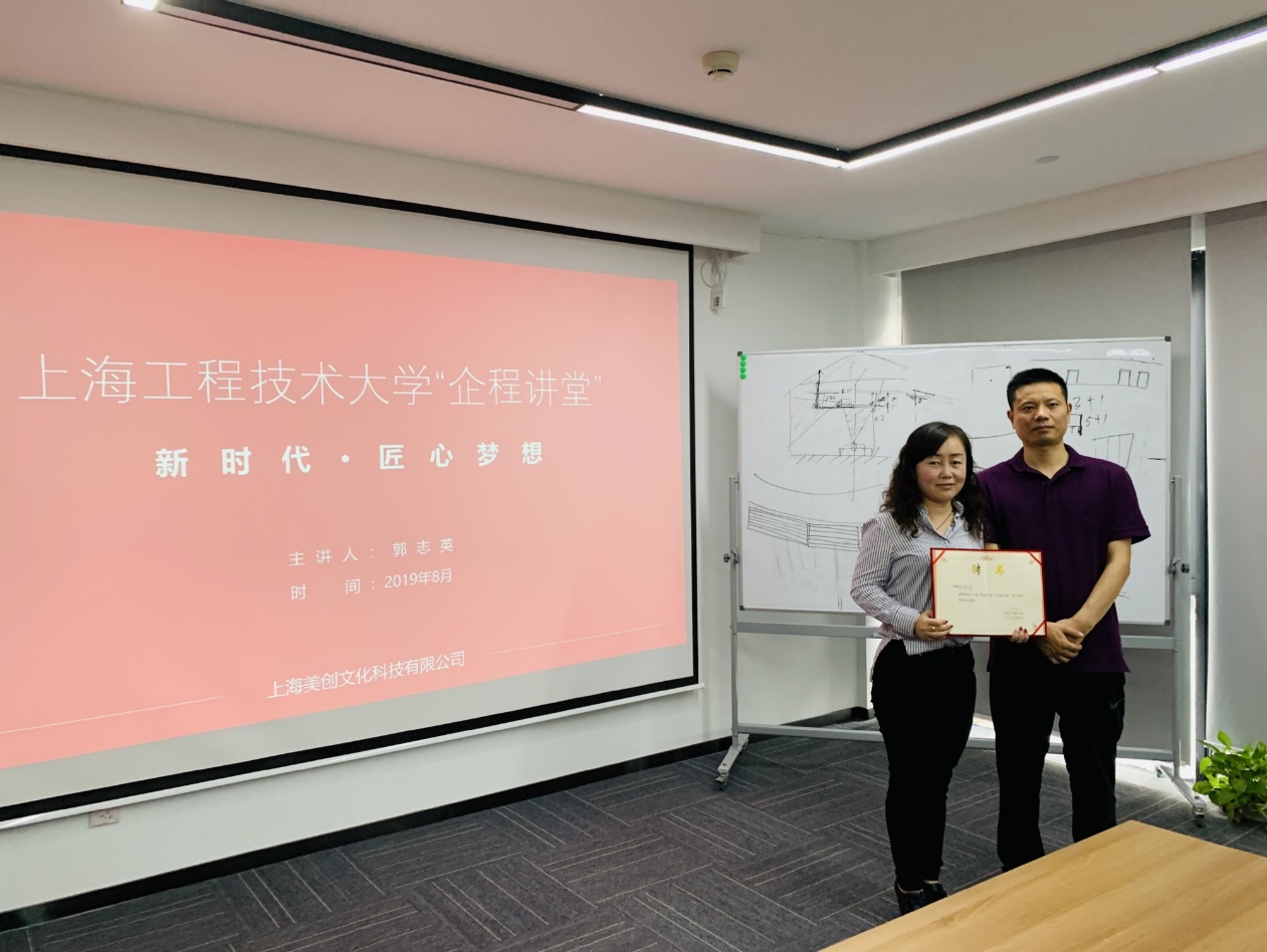 在“企程讲堂”开始前,中韩多媒体设计公司副经理顾艺老师代表校方向郭志英总经理颁发“企程讲堂”项目导师聘书。随后郭总以“新时代·匠心梦想”为主题,对工程大中韩公司的员工代表进行“思政教育”,郭总对设计行业的匠心精神进行了深刻解读,同时结合本公司内的实际案例让在座的老师和同学体会到在设计行业中的“匠心营造”的重要性。上海美创文化有限公司以营造好“小家”的氛围的前提下,逐步向外扩展推进,为促进社会“大家”的发展不断从根本思想上培养和提高当前公司员工水平,同时对于我公司参与校企合作实习的同学们则更是从思想态度上严格把控,从每份工作任务中磨练员工的学习心态,为他们树立正确的价值观。也从实际操作中让同学们认识到一个成熟项目的设计内容、前期准备与企业文化的结合,并在此之中如何提高工作质量实现“新时代·匠心梦想”。设计总监陈超宇先生则是从整个设计产业的方方面面进行了基本概况阐述,强调好的设计必须综合全面考虑,但无论如何在“匠心精神”的塑造前必须保有良好的学习心态。