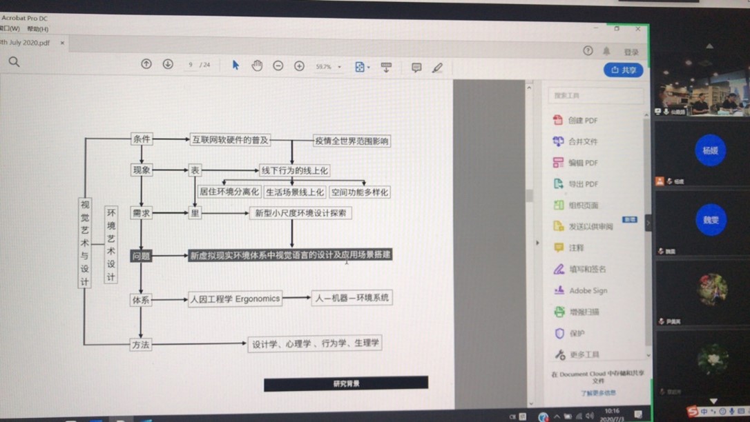 2020年7月3日上午中韩多媒体设计公司组织全体中方教师举办科研研讨会。本次科研沙龙举办的目的为给各位专业老师在科研方向和学术兴趣上带来启发。本次会议分为线下及线上同步进行,线下会场位于仙霞路长宁校区演讲厅,线上会议为腾讯平台。