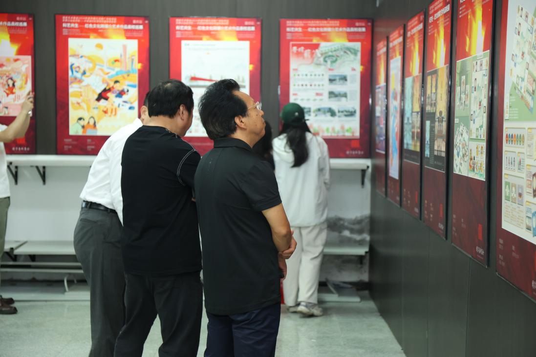 开幕式后,与会领导嘉宾在第二教学楼行筑厅参观了红色文化跨媒介艺术作品高校巡展系列作品,并在明德楼观看了重庆交通大学师生创作的“两路”精神原创作品。