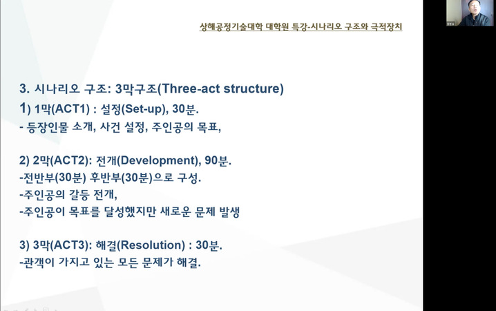 11月19日下午13:00,中韩多媒体设计公司邀请韩国东西大学设计公司金东贤教授在线举行“剧本结构和戏剧装置”的专题讲座。剧本结构就是对创作素材的布局和裁剪,也就是对情节的安排。这犹如日常生活中的裁剪衣服,布料即为创作素材,裁剪即为结构。情节或素材是内容,结构是形式、手段。影视剧作的结构是千姿百态的,而造成影视剧作结构千姿百态的根本原因,是影视剧本内容的丰富多彩。金东贤教授从两个方面阐述了剧本的产生:一...