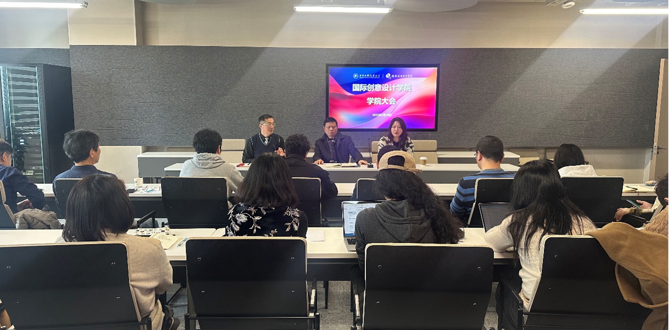 On 28 February, the International Institute of Creative Design (IICD) held a college assembly for the new semester in Conference Room 1009 of the Industry-Education Integration Building. The purpose of the assembly was to implement the spirit of the university’s 2025 Spring Semester Strategic Planning and Mid-Level Cadres Meeting, providing clear direction for the tasks and responsibilities of the coming semester. Professor Gu Yi, Dean of the Institute, presided over the assembly, which was attended by all members of the Institute's leadership team and teaching staff.