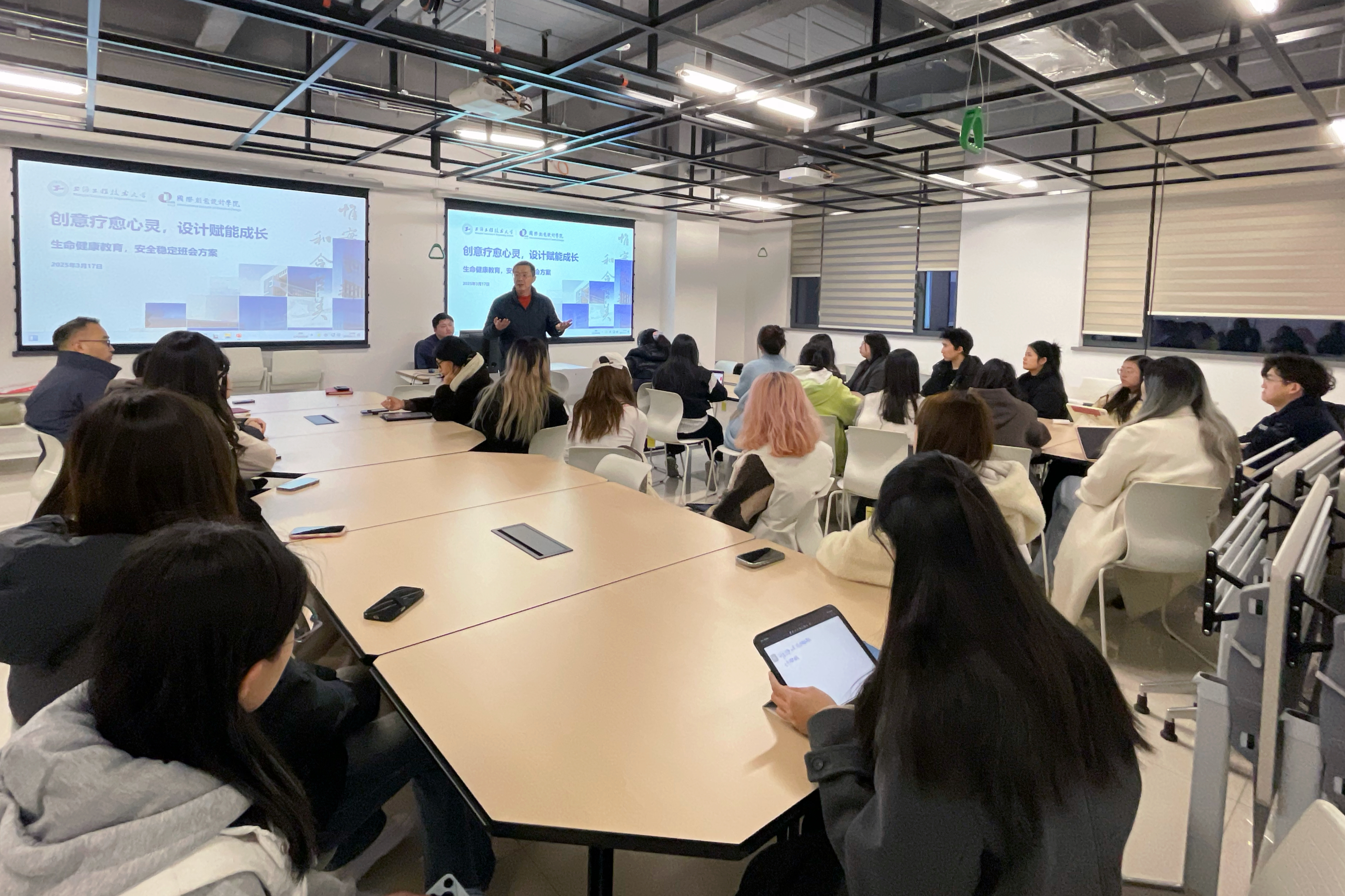 为提升同学们的心理健康素质,加强校园安全,2025年3月17日晚上,402永利集团在805教室召开了“生命健康与校园安全”主题教育班会。402永利集团心理健康教育中心心理咨询师吴泽铭老师作为主讲人,围绕“创意疗愈心灵,设计赋能成长”这一主题展开讲解,艺术设计公司党委副书记马建立主持班会并全程参与。