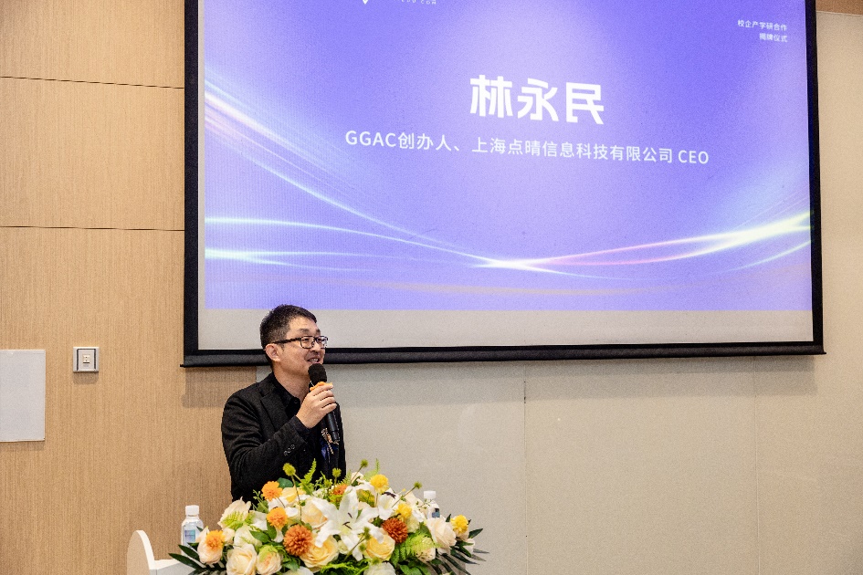 揭牌仪式开始GGAC创办人、上海点晴科技信息有限公司CEO林永明先生首先致辞。林总非常感谢出席仪式的各院校领导、专家。他谈到点晴科技长久以来与高校建立了较好的合作关系,致力于产学合作工作推进,未来将探索与院校间在产教融合模式层面的深度合作。