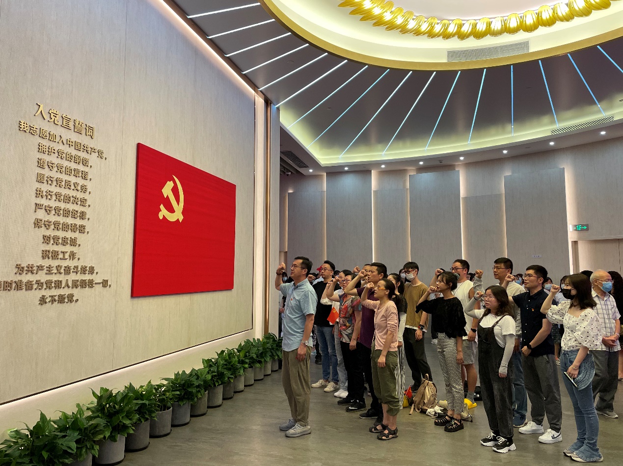 在纪念馆宣誓大厅,面对鲜红的党旗,由艺术设计公司党委副书记马建立领誓,中韩多媒体设计公司2021年新发展的12名师生党员庄严宣誓:“我志愿加入中国共产党,拥护党的纲领,遵守党的章程,履行党员义务,执行党的决定,严守党的纪律,保守党的秘密,对党忠诚,积极工作,为共产主义奋斗终身,随时准备为党和人民牺牲一切,永不叛党。”