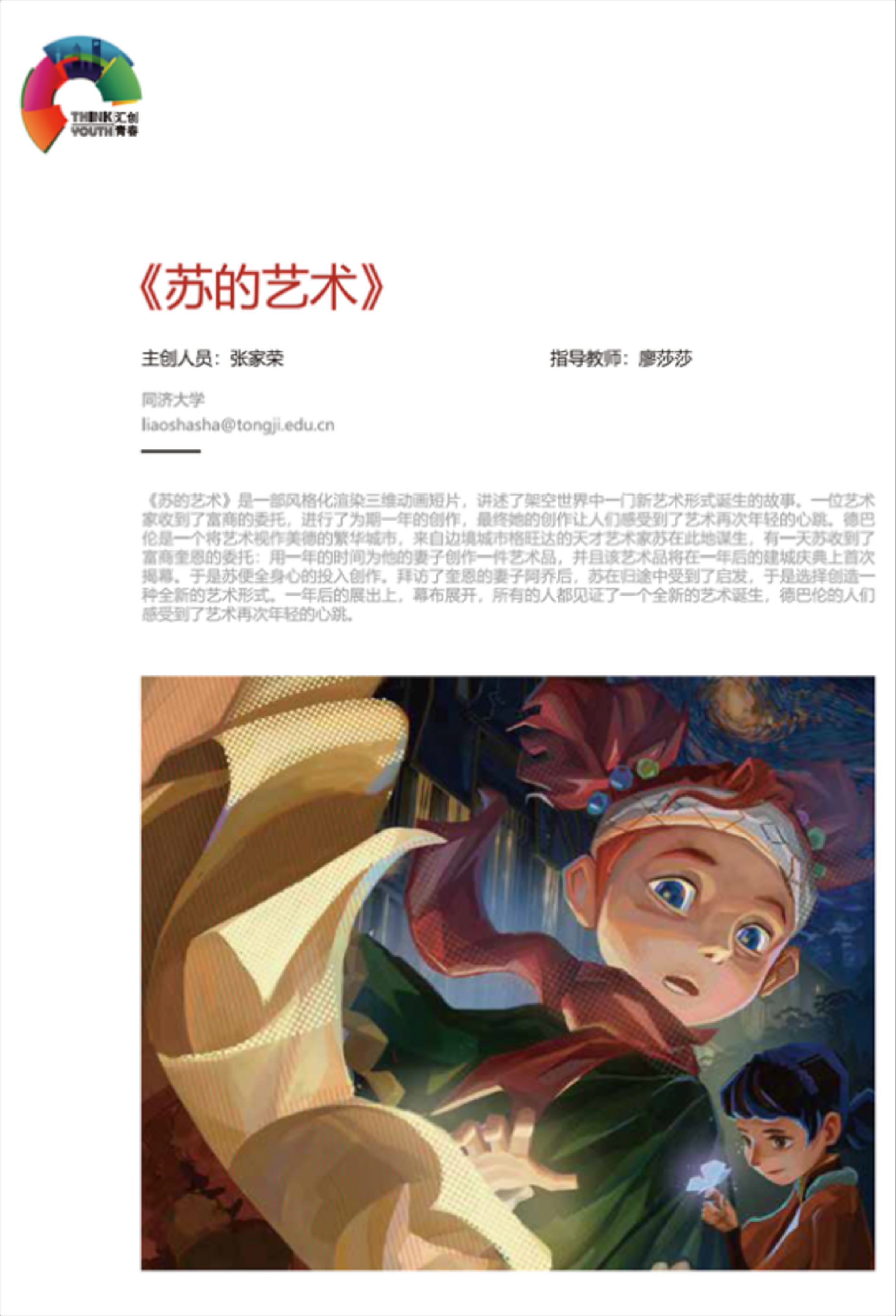 动画作品方面,风格化三维动画短片《苏的艺术》以虚构世界为背景,讲述了一门新艺术形式诞生的故事。影片通过艺术家的创作旅程,展现了艺术创新的激情和艺术本体的青春脉动,彰显了青年设计师对艺术本质的深度思考。