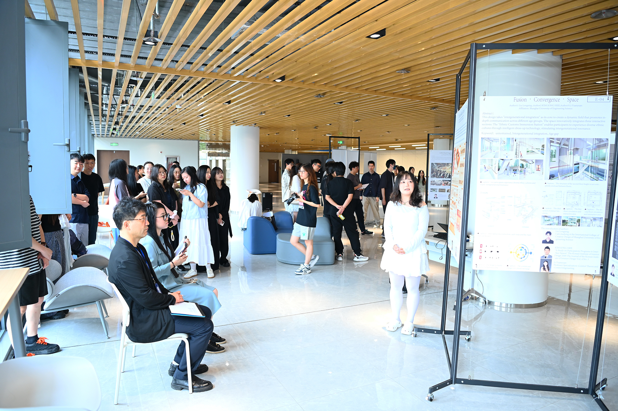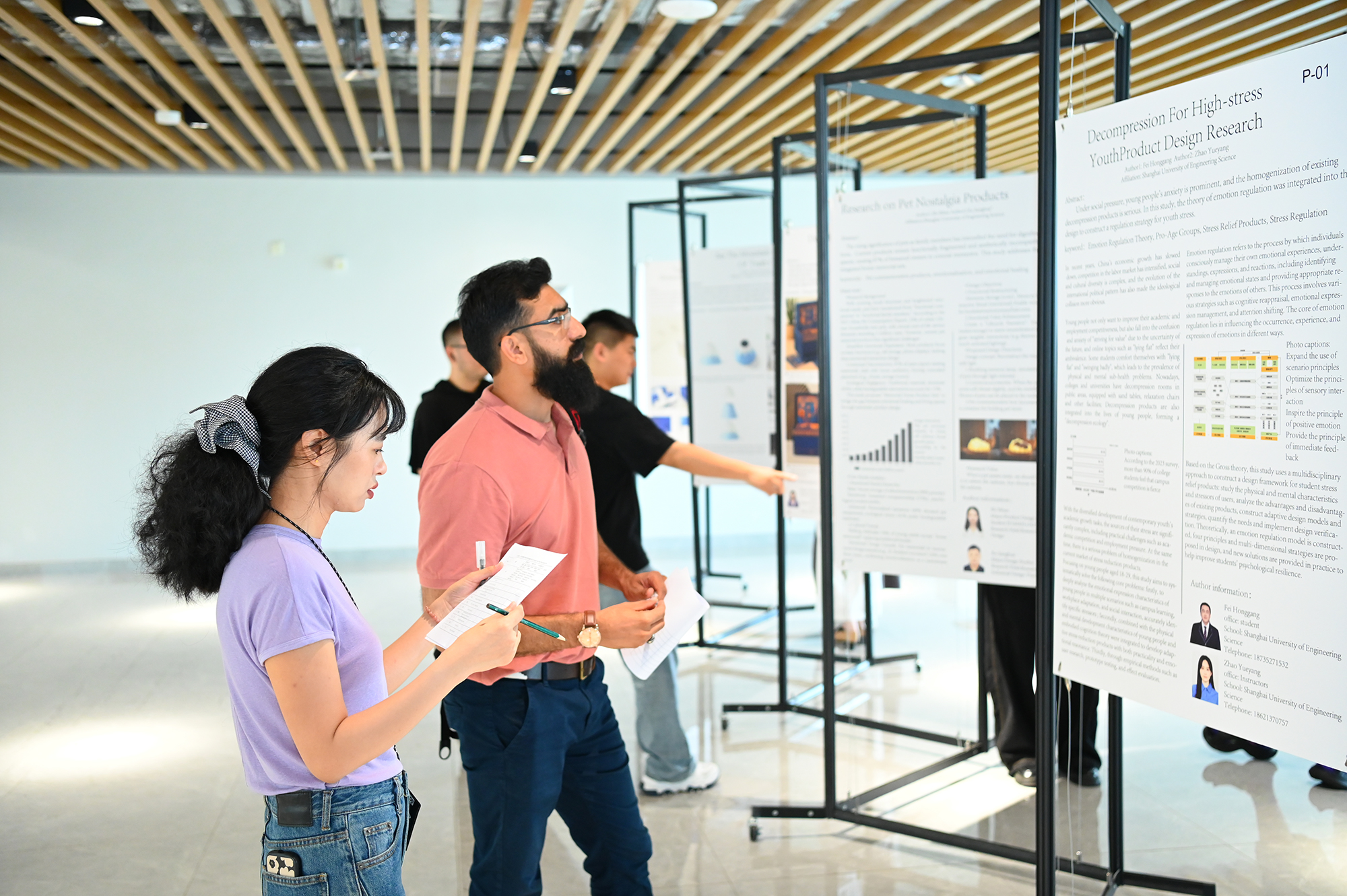 开幕式后,研究生们分组展示学术成果。数媒方向围绕“AI艺术设计与沉浸体验”分享案例,产品方向聚焦“非遗活化”展示陶瓷工艺与数字技术融合设计,会展方向以“非物空间建构”为核心呈现数字化展示方案。各方向教师联合外籍专家组成评审组打分。