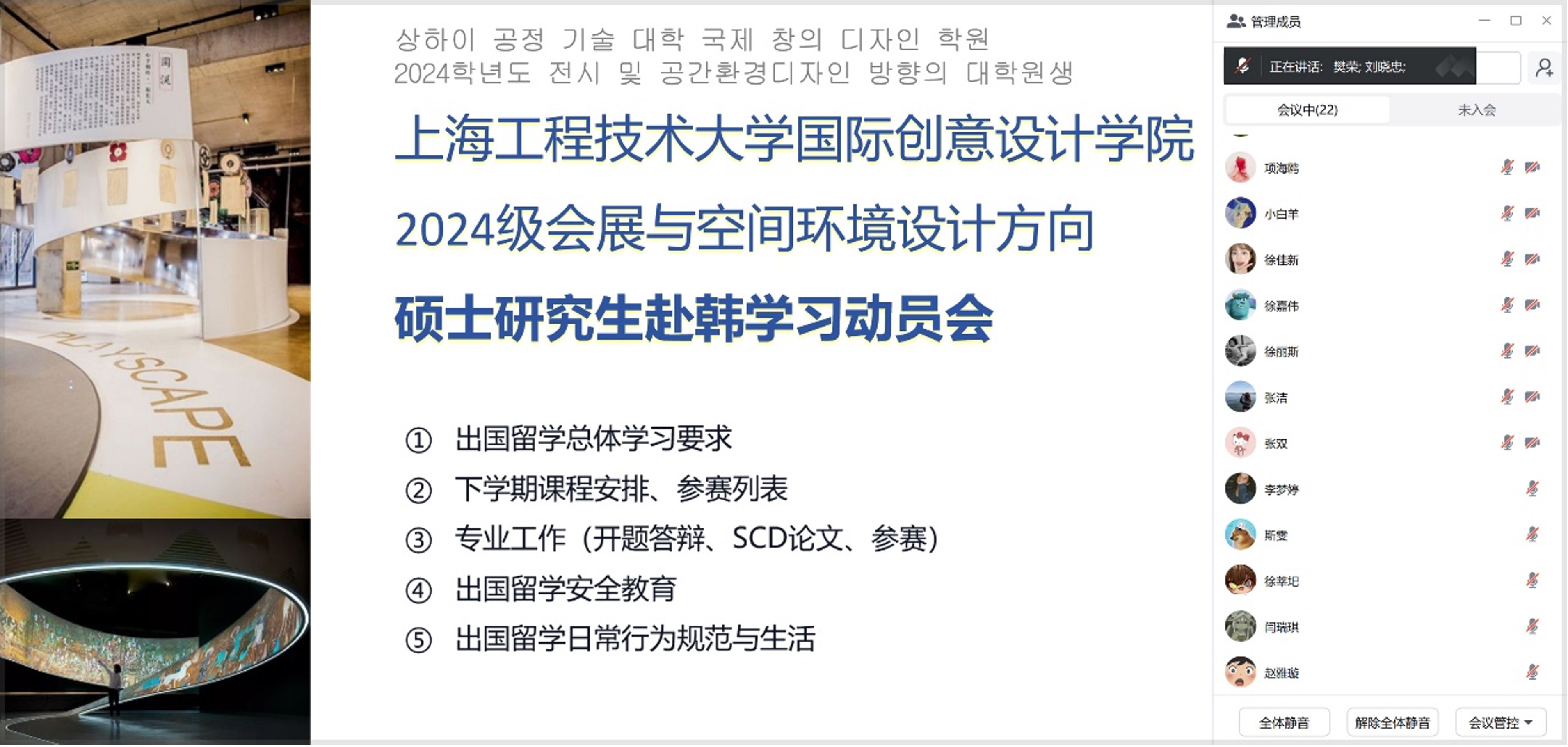 2025年8月28日晚上19:00,402永利集团以线上会议形式召开了“2024级会展与空间环境设计方向硕士研究生赴韩学习动员会”。402永利集团副经理樊荣、研究生秘书王冠夷、辅导员李志海、外事秘书刘晓忠及研究生导师咸妍、聂莎、徐嘉伟,会展方向全体赴韩研究生及部分员工家长出席会议,会议由樊荣副经理主持。