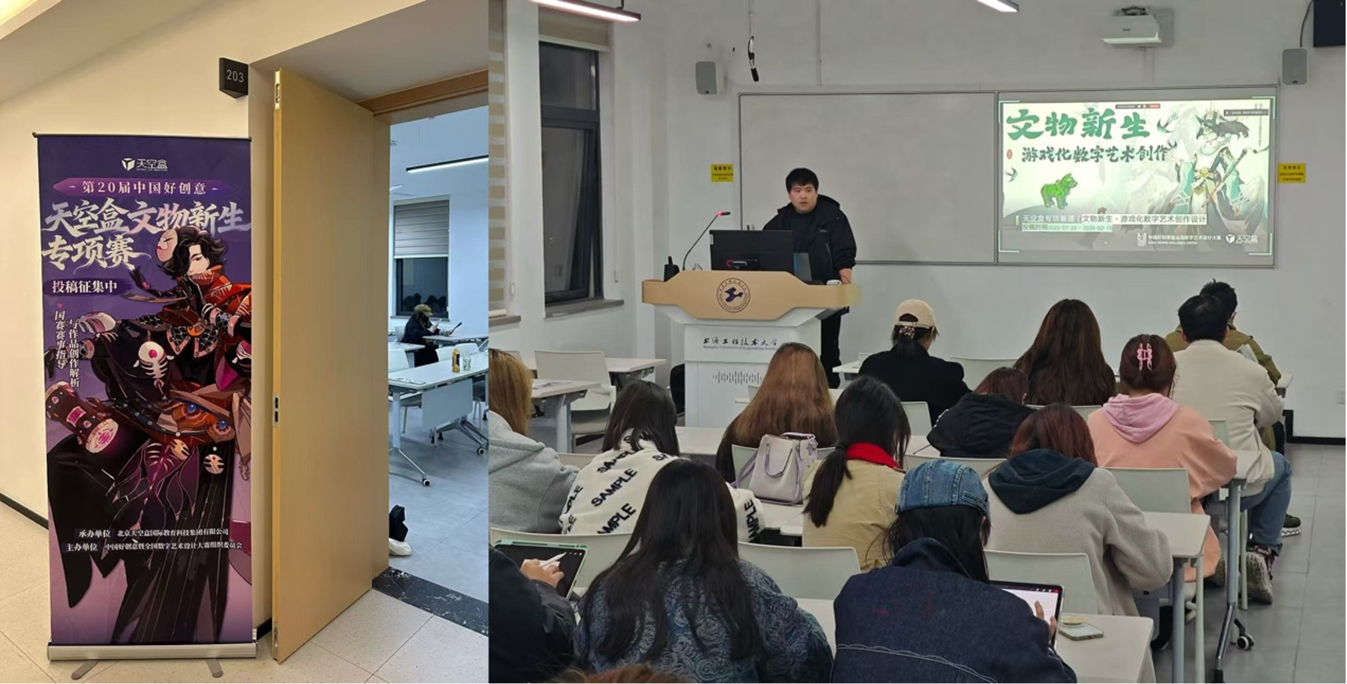 宣讲会上,企业讲师围绕“第20届中国好创意—天空盒文物新生专项赛”进行了系统介绍,重点解析了本届竞赛的命题方向与核心理念,并展示了往届优秀获奖作品。在讲解过程中,讲师从创意转化、视觉叙事、文化元素再设计等多个维度剖析优秀作品特征,使同学们更直观地理解专业表达如何与文化创新相结合。