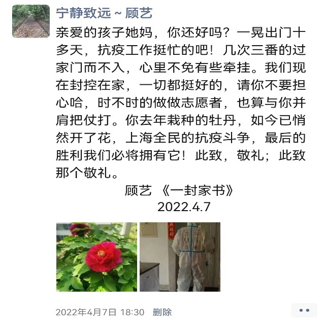 义无反顾,勇往直前。顾艺同志由于社区封控居家办公,每天有许多会议、事务需要处理,虽然他家里上有老,下有小,其爱人也长时间奋战在抗疫第一线一班到底,家里的重担都压在他身上。但只要时间允许,他就义无反顾的投入到社区的志愿工作中,全方位的服务小区居民,核算检测辅助、分发快递,巡逻等,社区哪里都可以看得到顾艺同志的身影。有一次他与爱人线上交流工作时很自豪的说道:“别看你冲在抗疫第一线,我也没有给你丢脸。”