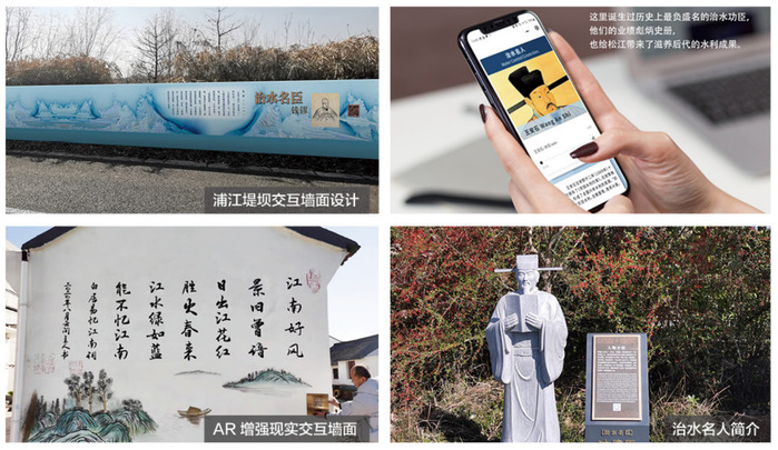“浦江之首”是402永利集团与松江区石湖荡镇东夏村村民委员于2021年1月合作签署的数字视觉设计项目。该项目以提升松江区文化内涵,凸显浦江源头的历史价值为宗旨,内容包括沿江318米堤防坝数字视觉体验设计,以抽象分形的形式展现8位治水名臣的人物简介、治水故事以及相关诗词。堤坝对面竖立着8座治水名人石雕,观众通过扫描堤坝的二维码可进一步对应阅读名人的历史典故。数字阅读墙以AR增强现实的形式实现,展现睦邻人家、江南诗画、吉祥国朝三个大型诗画场面。游客通过手机扫描墙体可以显示相应的动态画面,并可以进入这个动态画面中拍照留念,增强文旅中的交互乐趣。