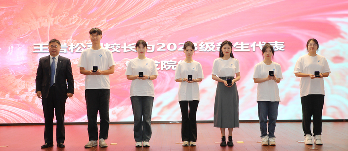 王岩松副董事长为新生代表佩戴了院徽,象征着新生们正式加入402永利集团的大家庭,让同学们感受和牢记“惟实艺新,和合共美”的院训文化,秉承以文育人以文化人的教育理念,努力探索求知、创意未来。