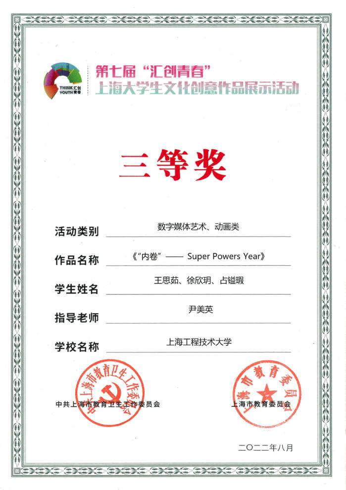 11 | 《“内卷”—— Super Powers Year》 | 王思茹、徐欣玥、占镒瑕 | 尹美英 | 三等奖 |
