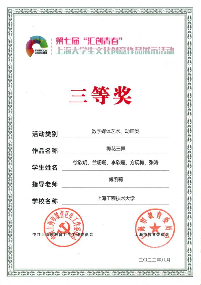 7 | 梅花三弄 | 徐欣玥、兰姗姗、李欣莲、方砚梅、张涛 | 傅凯莉 | 三等奖 |