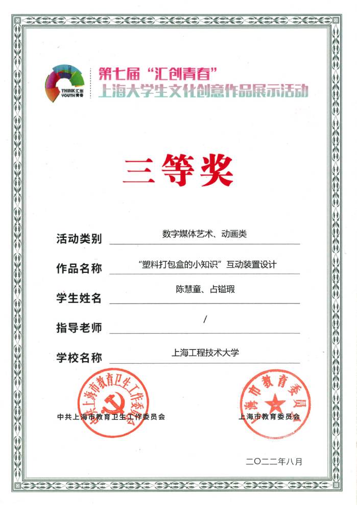 8 | “塑料打包盒的小知识”互动装置设计 | 陈慧童、占镒瑕 | 三等奖 | |