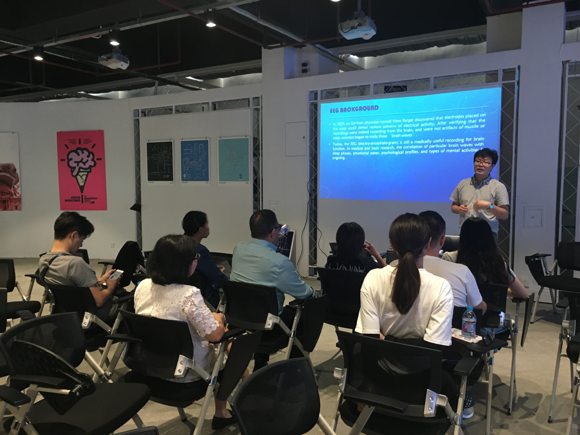 实验中心负责人旅日归国的黄晶石博士阐述了该实验室的建设初衷,日本在工科设计方面的思维模式及艺工结合的方式方法,并针对未来和设计的结合做了系统化地描述。现场还对脑波测量技术进行了演示。双方约定今后就相关领域展开跟深入的互访和学术交流活动。