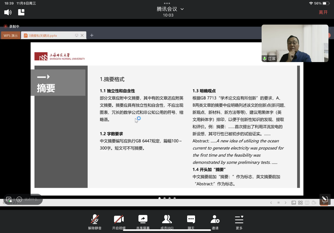江滨教授在讲座开始时强调了论文摘要的格式规范和关键词的重要性。他指出,摘要应以简明扼要的语言呈现论文核心内容,避免使用图表、冗长的数学公式和缩略语。此外,摘要必须概括论文的四个创新点:新观点、新方法、新材料、新问题,确保论文具备至少一个创新点。关键词的作用在于方便他人检索论文,同时也有助于提高论文在相关领域的可见度。江教授建议增加关键词的数量,以减少阅读量,使其更贴近所需主题。