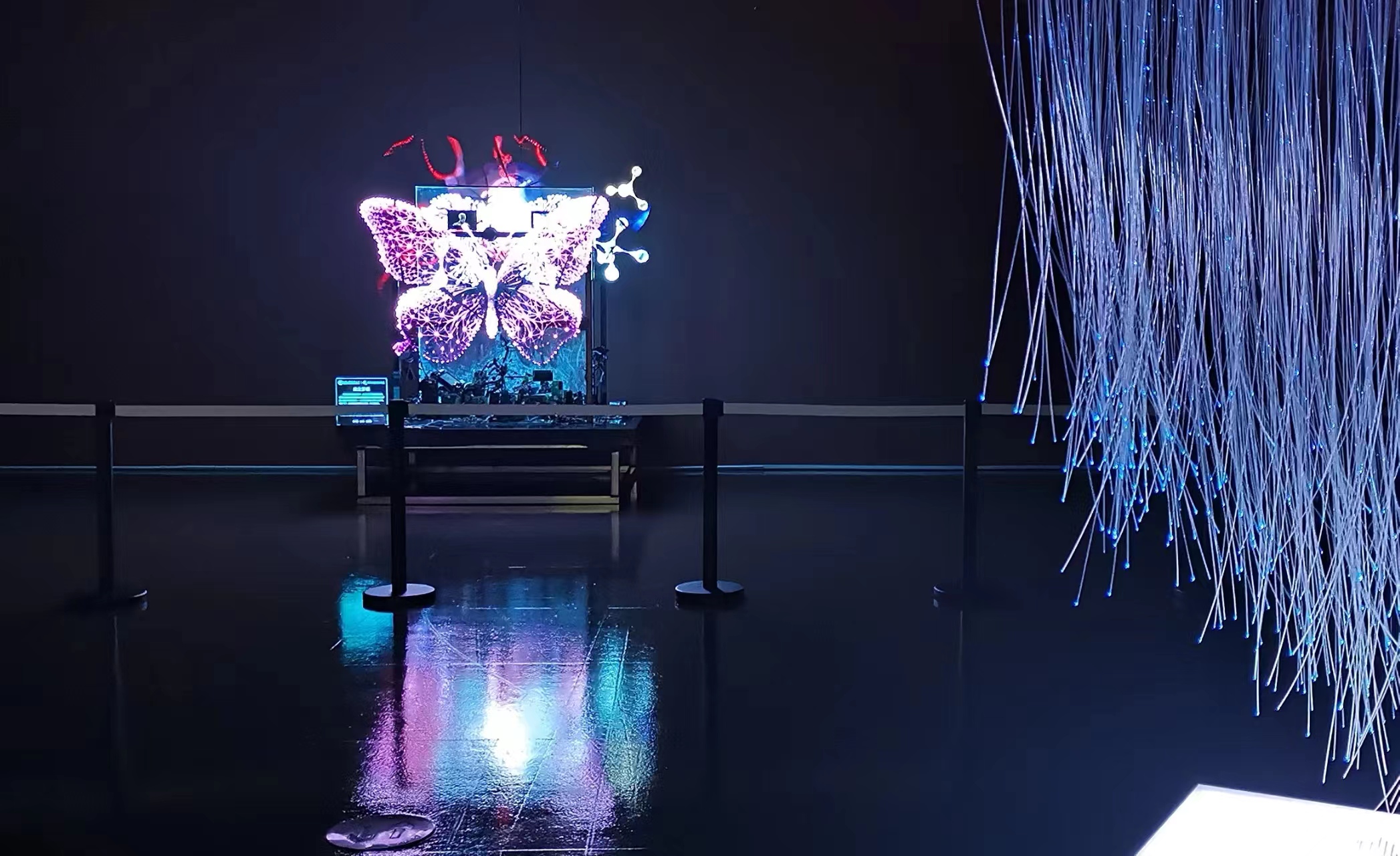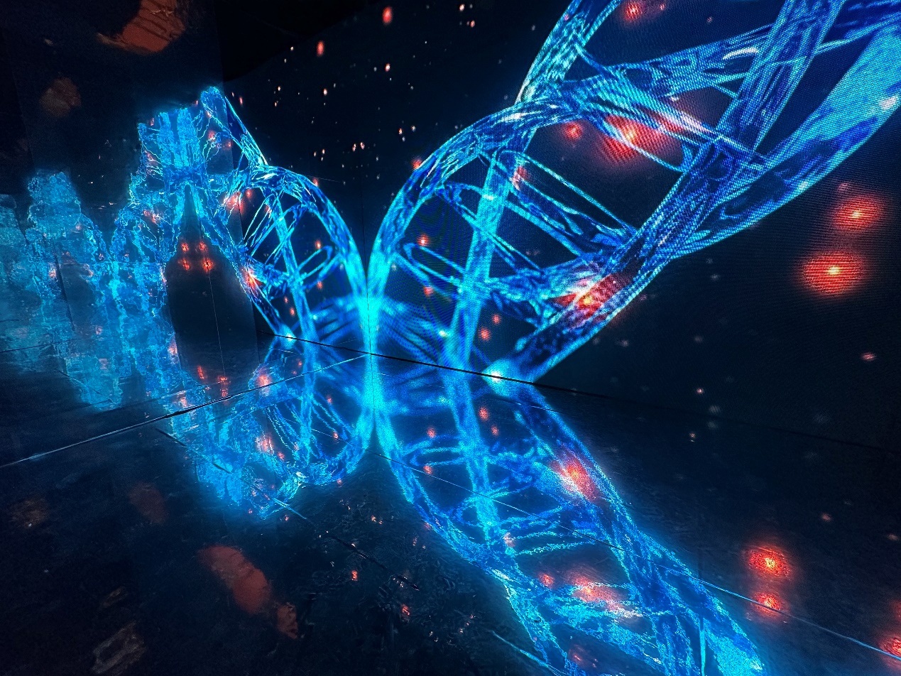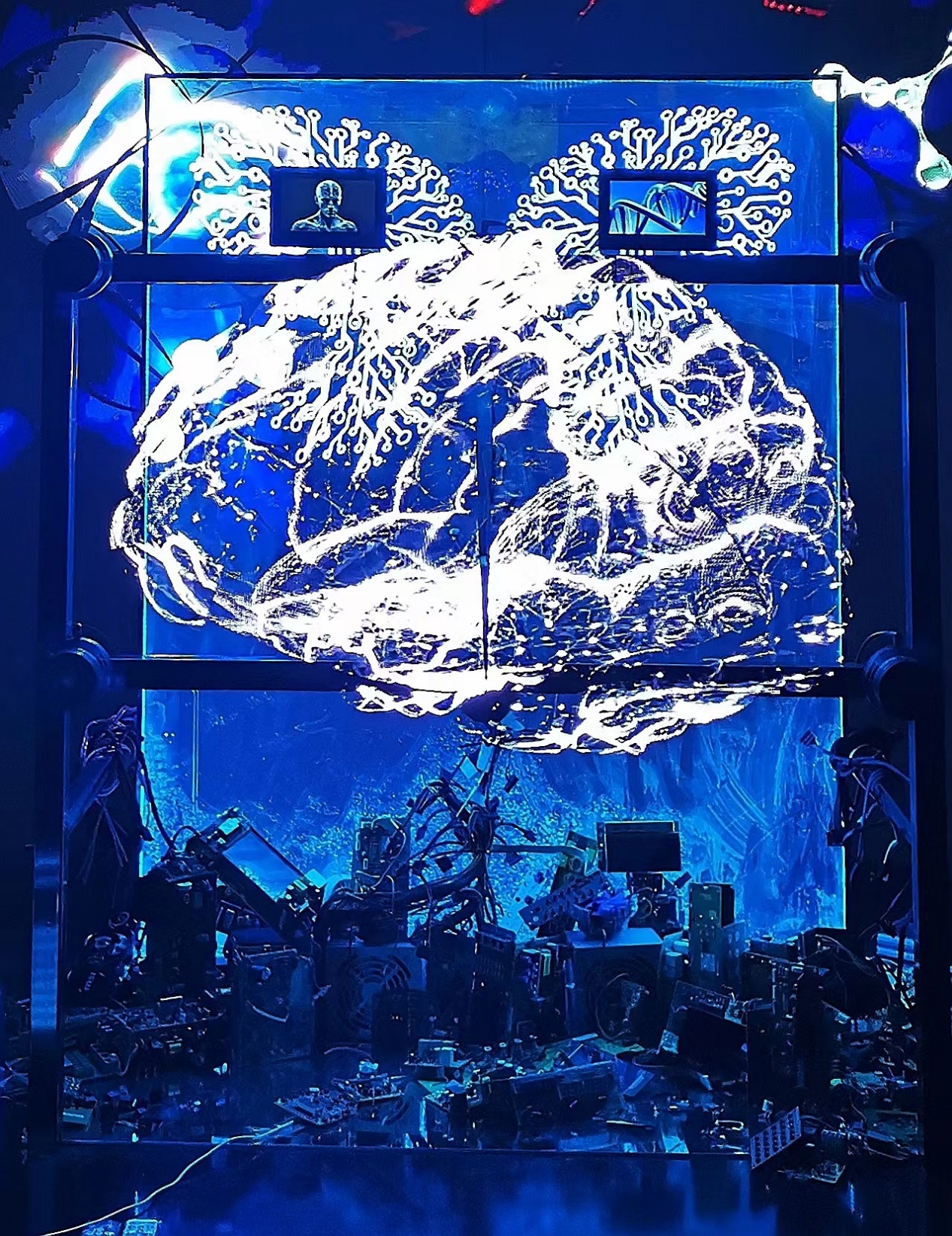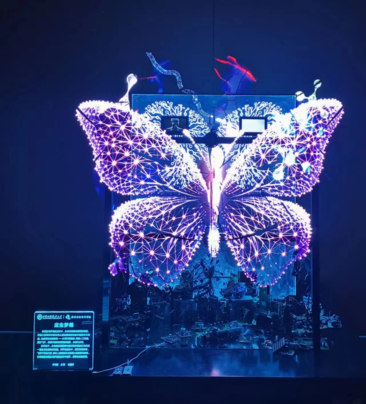 402永利集团宁书家、王郅、徐嘉伟三位老师的实验装置、跨媒介交互作品《庄生梦蝶》,用一个众人皆知的中国传统故事为题,以动态画面展示了生命从原始基因密码延伸至数字化的奇迹,翻飞的蝴蝶象征着生命的飞跃。樊荣老师的作品《生命镜界 同源异构》表达了一切生命平等同源,彼此之间应相互爱护,和谐构建地球生命共同体。其中,《庄生梦蝶》获得白玉兰美术佳作奖。