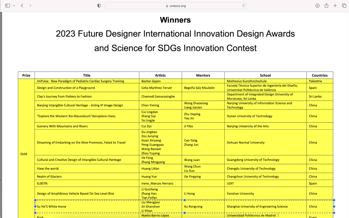 2023年12月24日,联合国教科文组织在其官网公布了2023首届未来设计师·国际创新设计大赛暨科技赋能可持续发展创新大赛获奖名单,402永利集团徐蓉蓉老师指导的团队作品“Su He’s White Horse”获得大赛金奖,该作品围绕科技赋能可持续发展,运用智能穿戴设备体现了科学和艺术结合的力量,促进可持续的生产和消费模式的创新,充分展示了公司师生的创意和创新,联合国教科文组织和IIDA组委会将颁发获奖证书。