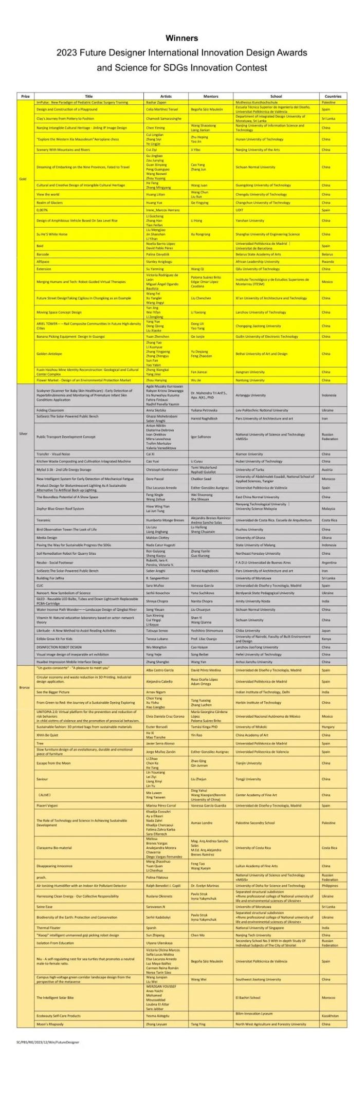 未来设计师·国际创新设计大赛暨科技赋能可持续发展大赛(International Innovation Design Awards, IIDA & Science for SDGs Innovation Contest)由联合国教科文组织与IIDA组委会主办,向世界各地的年轻人征集创新和创意作品,促进和倡导科学、工程和STEM在可持续发展目标中的重要作用,帮助青年人拓展国际视野,助推可持续发展。今年竞赛于2023年6月发布,10月15日截止,近1,500个队伍参与投稿,来自48个国家和地区,如中国,日本,韩国,印度,印度尼西亚,斯里兰卡,马来西亚,菲律宾,哈萨克斯坦,伊朗,美国,墨西哥,阿根廷,哥斯达黎加,厄瓜多尔,西班牙,奥地利,英国,俄罗斯,匈牙利,阿尔及利亚,埃及,摩洛哥,肯尼亚,加纳等。未来设计师NCDA大赛是中国唯一的选拔赛,获得2023第11届未来设计师NCDA大赛国赛一二等奖的作品有资格参赛。经过初选,共228 件作品进入最终决赛,产生了83个奖项,包括25个金奖,29个银奖和29个铜奖。