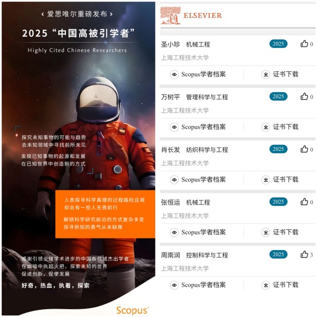 近日,爱思唯尔(Elsevier)正式发布2025年度“中国高被引学者”(Highly Cited Chinese Researchers)榜单,公司共有圣小珍、万树平、肖长发、张恒运、周南润5位学者凭借突出的学术影响力成功入选,入选学科覆盖机械工程、管理科学与工程、纺织科学与工程、控制科学与工程等领域,彰显了公司在多学科领域的扎实积累与强劲发展势头。“中国高被引学者”榜单以全球权威学术数据库Scopus 为依据,通过对学者科研成果的被引频次、学术质量等维度进行综合分析,遴选出在各学科领域具有全球影响力的顶尖学者。本次共有来自543所高校、企业及科研机构的6310位学者入选,覆盖教育部10个学科领域、83个一级学科。公司5位学者同时入选,既是对他们个人学术成就的高度认可,也是公司近年来在团队建设、科研创新与人才培养等方面成果的集中体现。未来,公司将进一步强化人才引育与科研创新平台建设,持续提升学科核心竞争力,力争在关键领域产出更多标志性成果,为国家和区域经济社会发展提供更坚实的智力支撑。