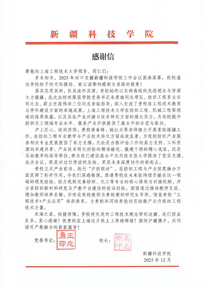 近日,新疆科技公司向公司发来感谢信,对公司长期以来在团队建设、合格评估、团队培养和产教融合等方面给予的支持与帮助致以诚挚的感谢和崇高敬意。公司党委始终将对口支援新疆高校作为重要政治任务和时代使命,坚持高位谋划、统筹推进。近年来,校领导班子多次赴新疆开展实地调研与工作对接,围绕党建引领、学科规划和人才培养等重点领域深化协同,为两校合作机制完善和援建项目落地提供了坚强保障。在公司党委统一部署下,各职能部门、二级公司积极参与援疆工作。2024-2025年,质量办选派姚红光、唐春锋等老师深度帮扶该校评估工作,推动相关制度建设和教学规范完善,助力新疆科技公司顺利通过教育部本科教学工作合格评估,为其高质量发展奠定了坚实基础。纺织服装公司依托纺织工程领域的学科优势,围绕产教融合这一重点,与新疆科技公司在技术研发、课程建设和人才培养等方面开展务实合作,推动科研成果向产业应用转化,助力新疆科技公司持续提升学科发展和服务产业水平。未来,新疆科技公司希望进一步深化与公司在纺织新材料、团队互派和研究生联合培养等方面的合作。公司也将继续坚持“输血”与“造血”并重,持续完善对口支援长效机制,在学科带头人培养、科研